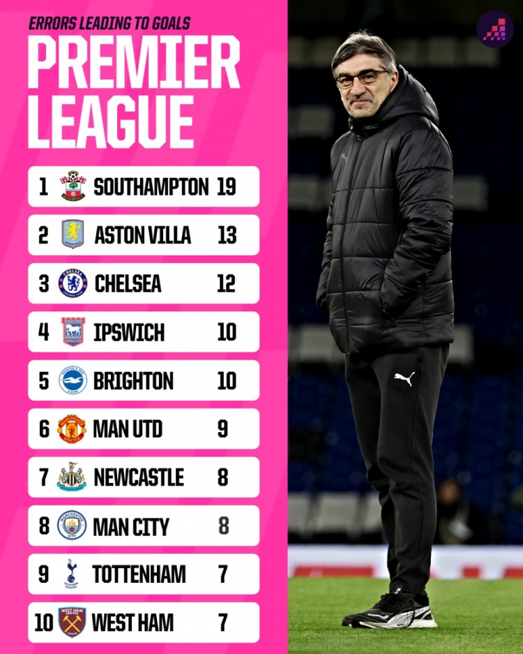 2月26日訊 根據(jù)統(tǒng)計,南安普頓本賽季在英超因失誤丟掉19球,所有球隊最多,比第二名維拉多出6球。目前在英超積分榜,南安普頓積9分墊底。
