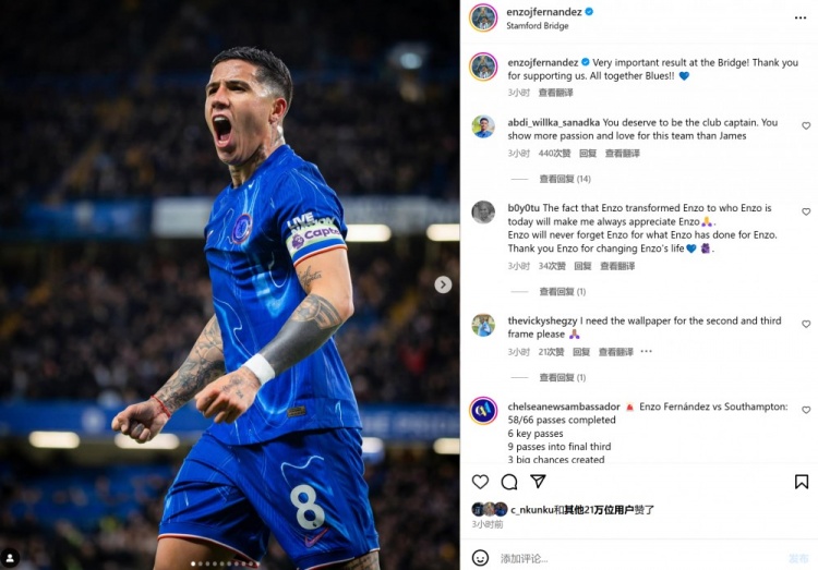 本場(chǎng)比賽恩佐首發(fā)出戰(zhàn)表現(xiàn)出色,貢獻(xiàn)7次關(guān)鍵傳球,賽后恩佐也在個(gè)人社媒曬出怒吼慶祝照,配文寫(xiě)道:“在主場(chǎng)取得一場(chǎng)重要的勝利,感謝大家的支持,藍(lán)軍全員團(tuán)結(jié)一致!”