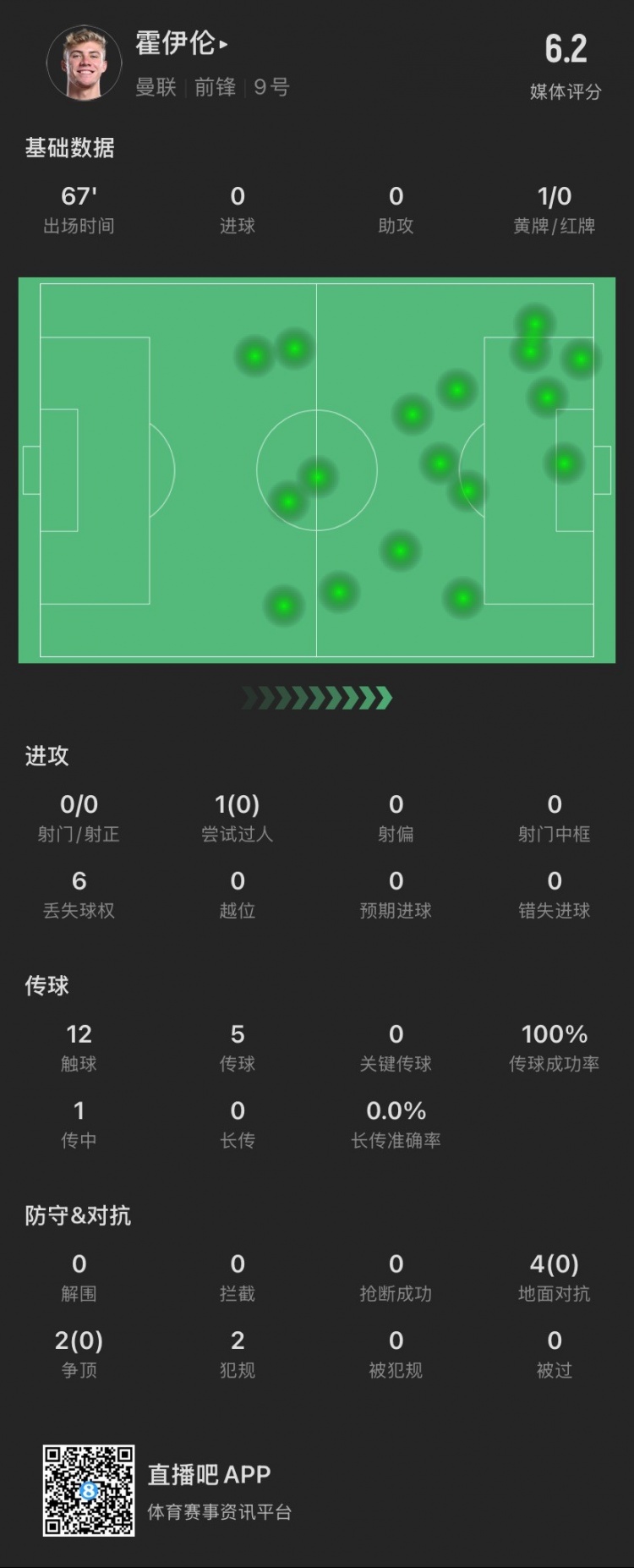 霍伊倫本場(chǎng):射門關(guān)鍵傳球等數(shù)據(jù)掛零,6次對(duì)抗0成功,僅觸球12次
