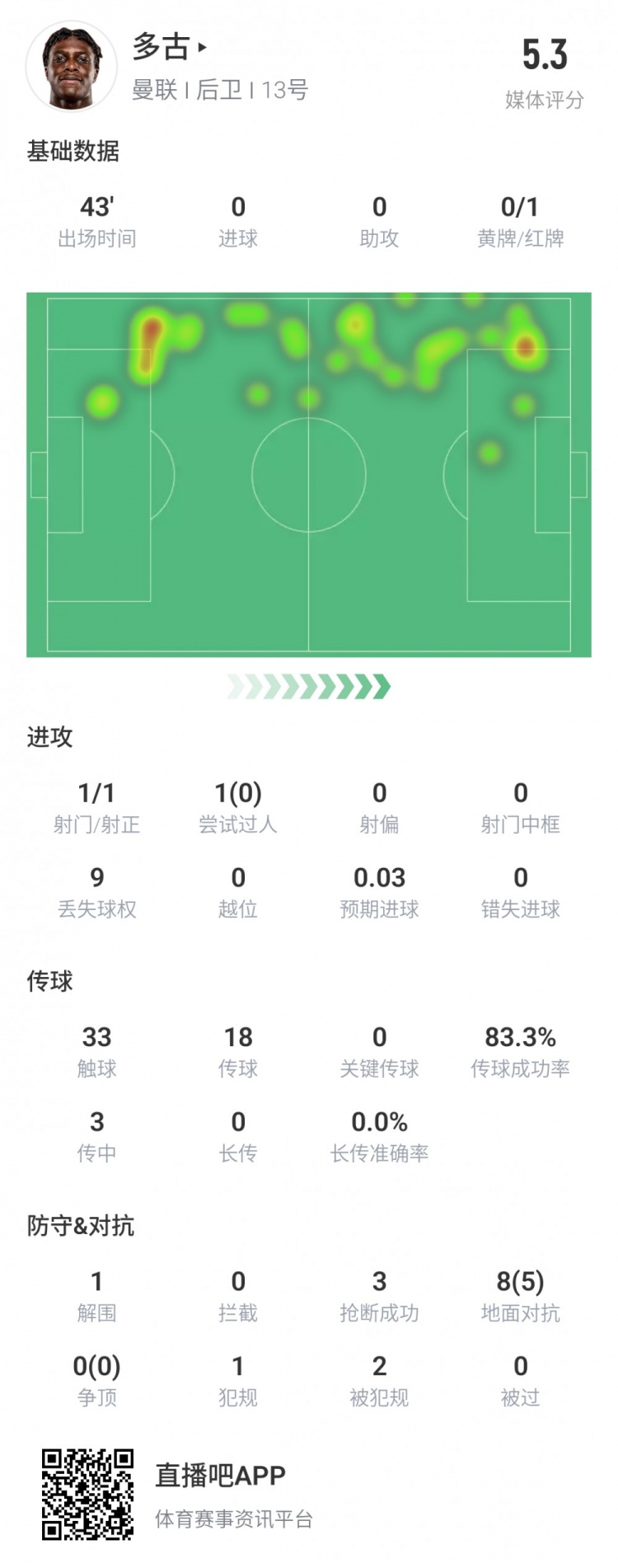 數(shù)據(jù)方面,多古出場43分鐘,1次送禮,1張紅牌。8次對抗5次成功,1解圍3搶斷。評分5.3分。