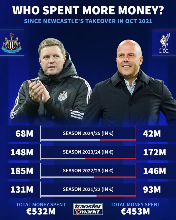 24-25賽季:紐卡6800萬歐元,利物浦4200萬歐元