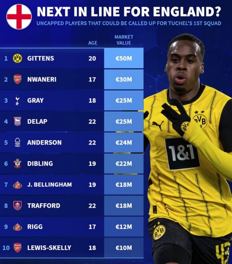 2月27日訊 《轉(zhuǎn)會市場》統(tǒng)計(jì)了當(dāng)前仍未被征召的英格蘭球員最貴身價情況,多特邊鋒吉滕斯領(lǐng)銜。