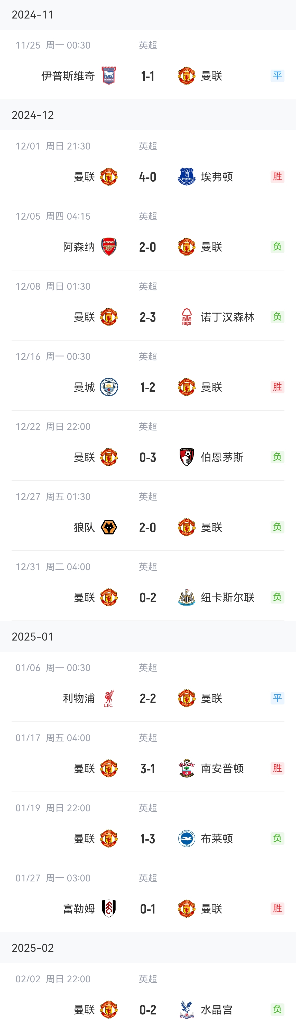 02月03日訊 曼聯(lián)主場(chǎng)0-2完敗于水晶宮,遭遇阿莫林帶隊(duì)以來(lái)的聯(lián)賽第7敗。