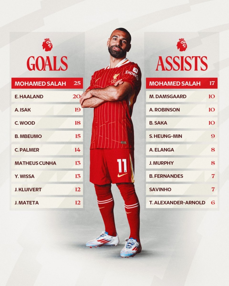利物浦社媒曬出了薩拉赫本賽季聯(lián)賽數(shù)據(jù)海報,目前這名前鋒進球數(shù)、助攻數(shù)均領跑英超。