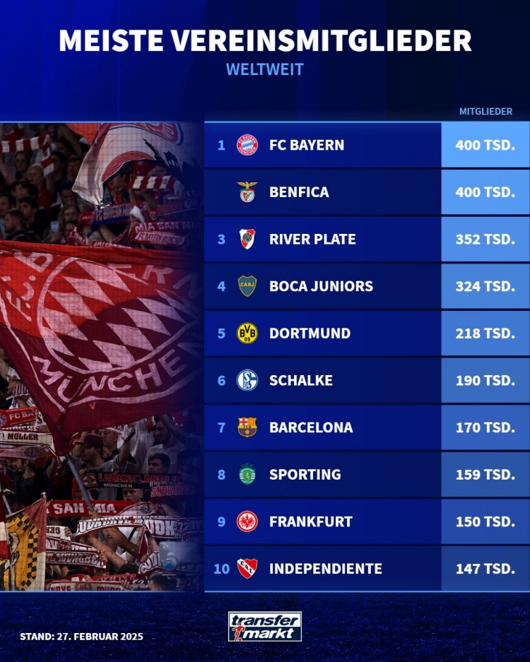 俱樂部會(huì)員人數(shù)排行:拜仁、本菲卡40萬居首,多特第5,巴薩第7