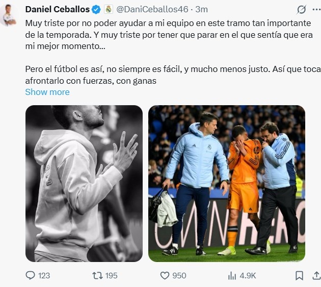 2月27日訊 皇馬官方宣布塞巴略斯左腿半膜肌受傷&肌腱受損,多家媒體表示他預(yù)計(jì)傷停2個(gè)月時(shí)間。塞巴略斯更新了社媒。