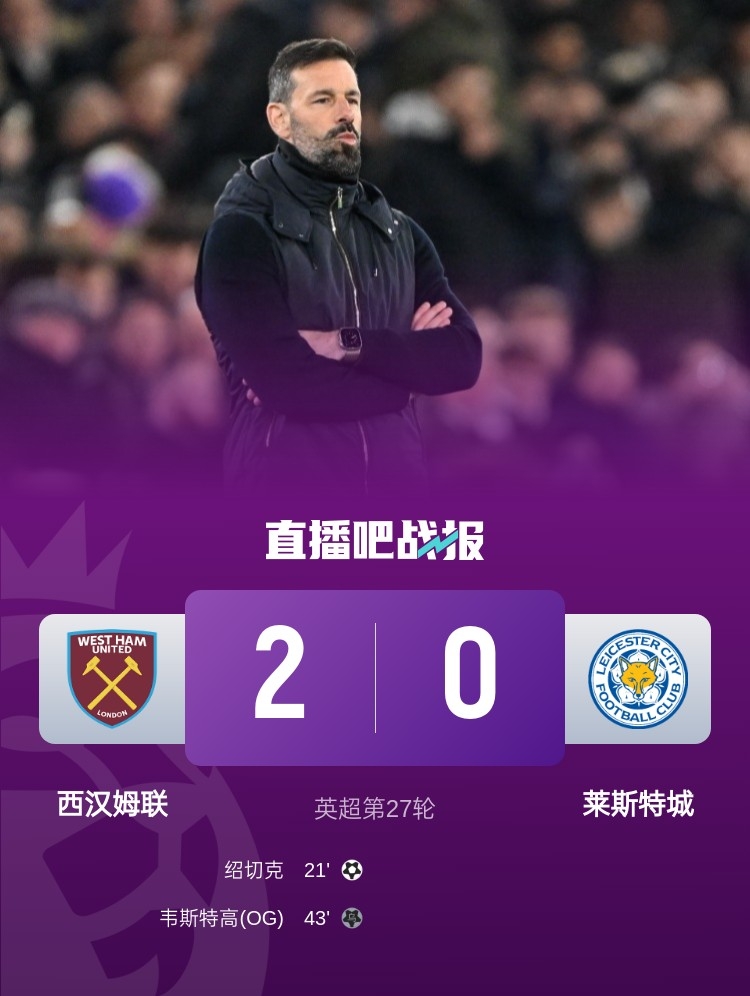 英超第27輪,萊斯特城客場0-2不敵西漢姆,遭遇各賽事5連敗。
