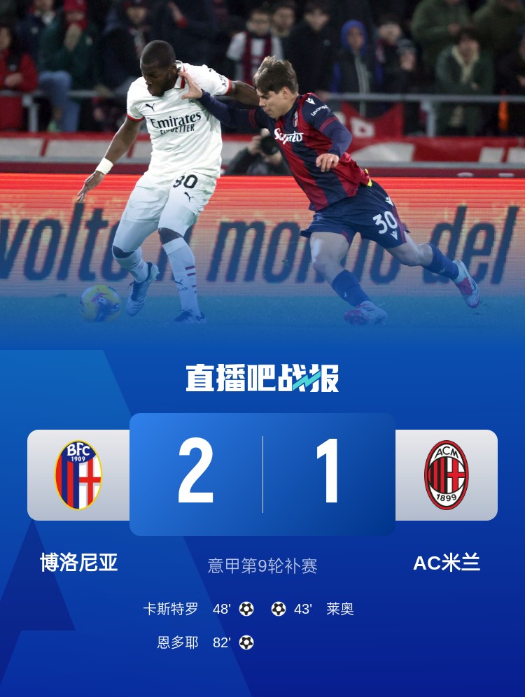 萊奧破門,米蘭1-2遭博洛尼亞逆轉,意甲兩連敗跌至第8名。