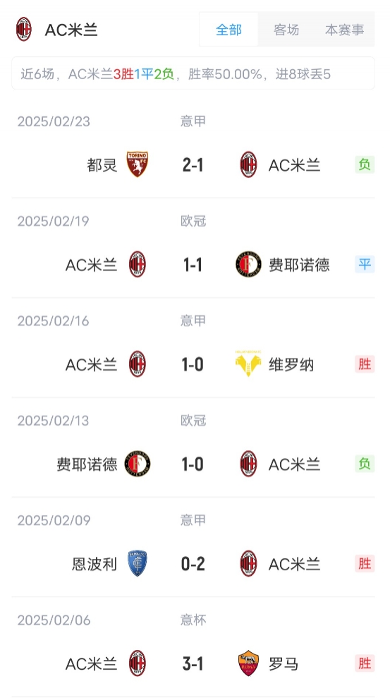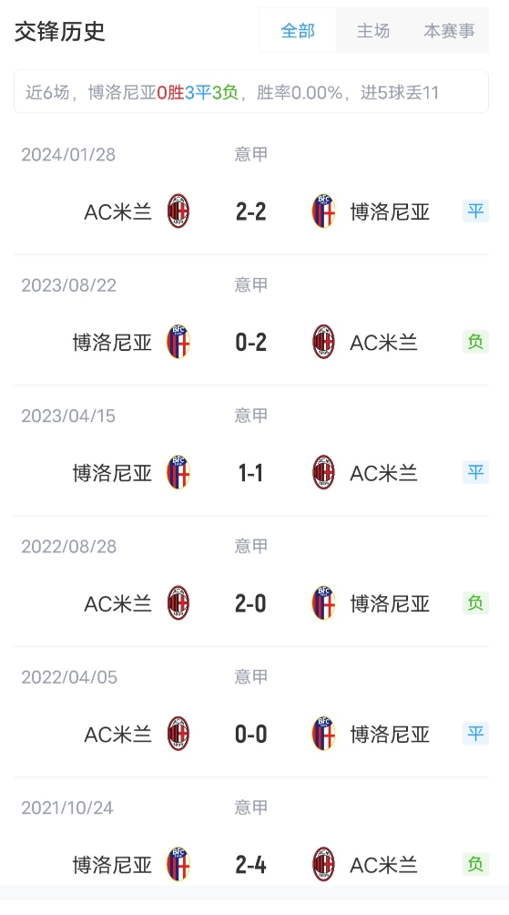 目前意甲25輪比賽過后,AC米蘭11勝8平6負積41分,位列意甲第7位。博洛尼亞10勝11平4負積41分,位列第8。