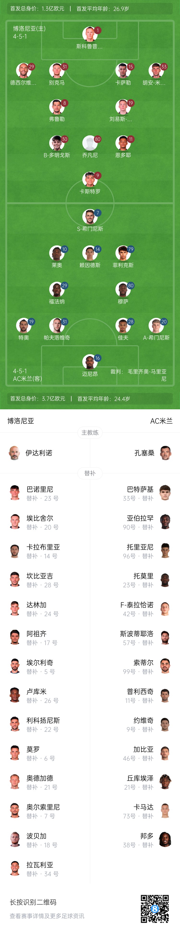 博洛尼亞替補:23-巴諾里尼、34-拉瓦利亞、5-埃爾利奇、14-伊令、22-利科揚尼斯、26-盧庫米、6-莫羅、17-阿祖齊、18-波貝加、20-埃比舍爾、7-奧爾索里尼、21-奧德加德、24-達林加、28-坎比亞吉