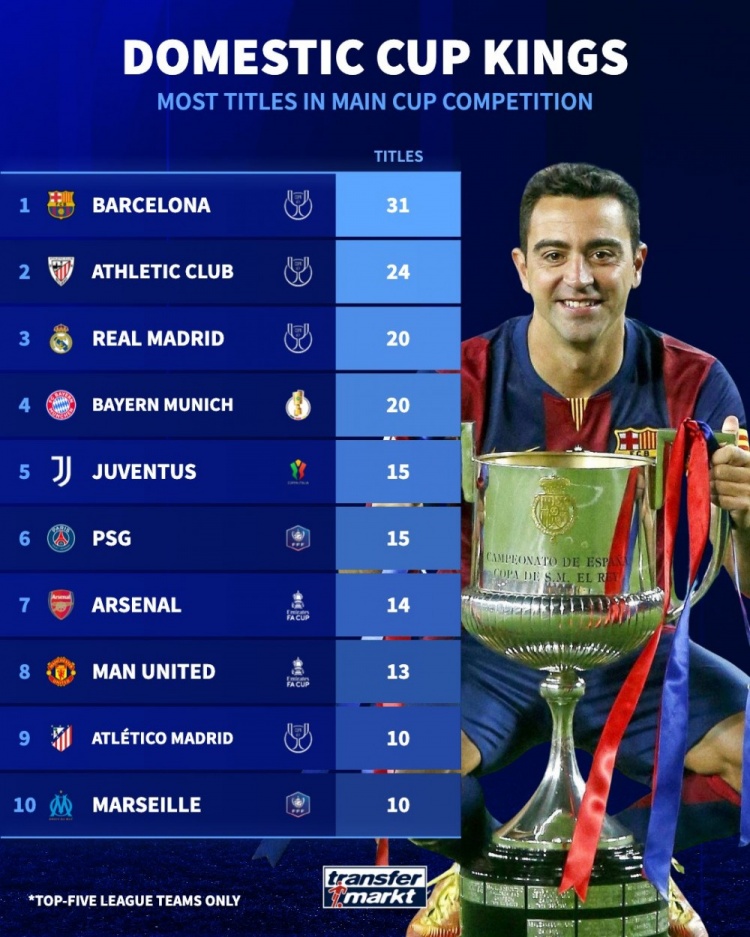 2月28日訊 五大聯(lián)賽的國內杯賽淘汰賽本周進行中,德轉列出了五大聯(lián)賽國內杯賽奪冠次數榜單,巴薩31次排名第一,畢巴24次排名第二。
