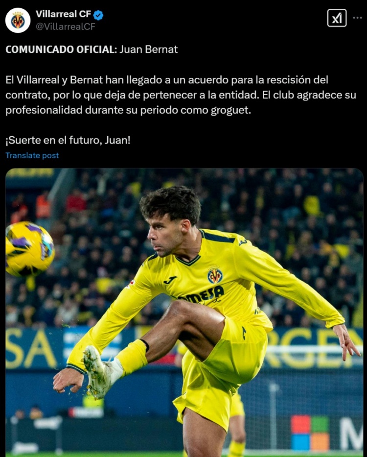 官方:比利亞雷亞爾和貝爾納特提前終止租借合同,球員恢復(fù)自由身