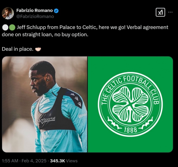 2月4日訊 名記羅馬諾用標(biāo)志性的here we go確認(rèn),水晶宮中場(chǎng)施魯普將以租借形式加盟凱爾特人。