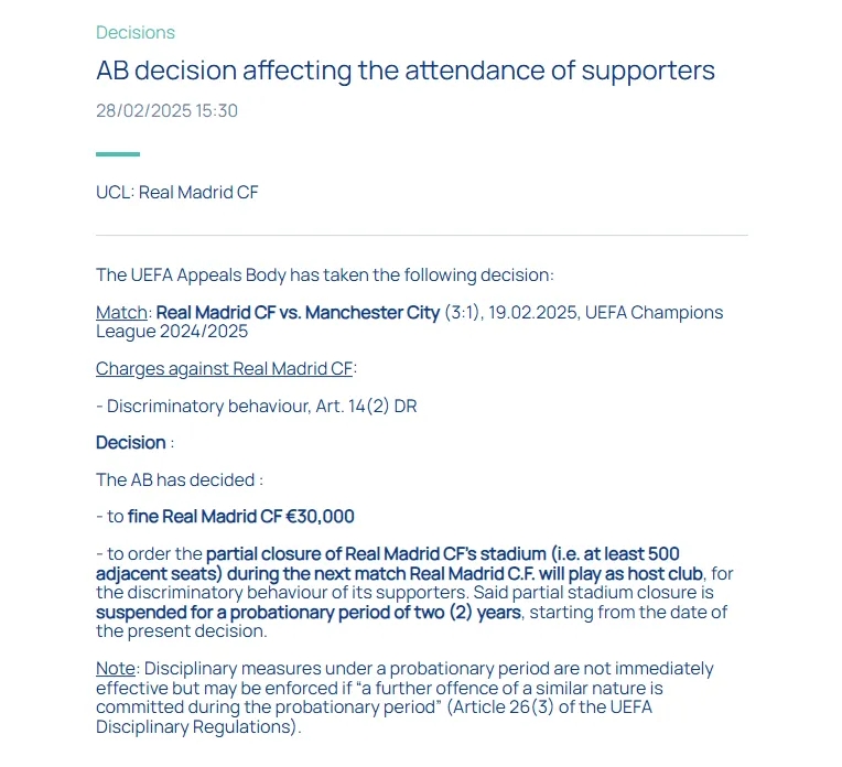 根據(jù)裁決書:“若皇馬球迷在未來兩年觀察期內再次出現(xiàn)類似違規(guī)行為,將立即執(zhí)行部分看臺關閉措施?!痹撚^察期自2月28日裁決公布之日起計算。除看臺關閉警告外,歐足聯(lián)還同步開出了立即生效的3萬歐元罰單。