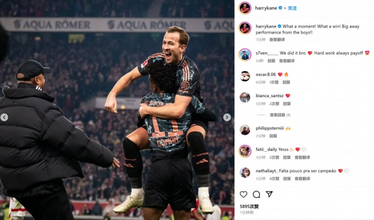 3月1日訊 拜仁在本輪德甲3-1逆轉(zhuǎn)斯圖加特,凱恩也在賽后通過社媒慶祝勝利。