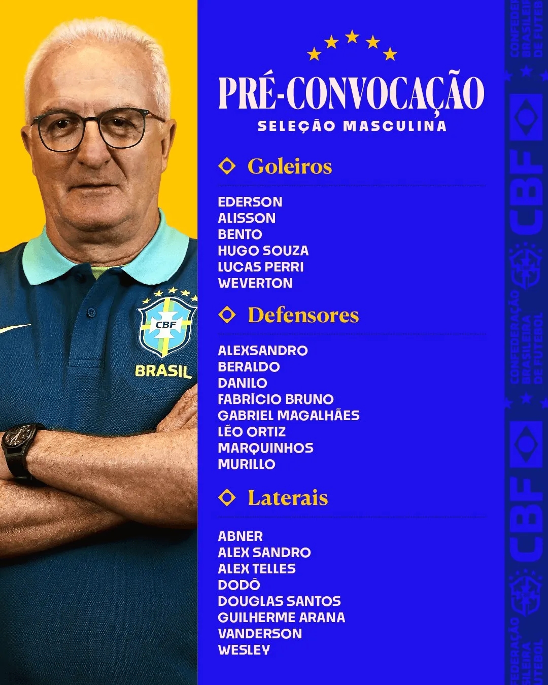 3月1日訊 巴西足協(xié)公布了一份由多里瓦爾選定的52名球員名單,他們將參加3月份的世預(yù)賽,巴西隊將于20日和25日分別對陣哥倫比亞和阿根廷,最終名單將于下周五公布。