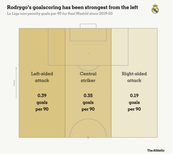 自2019年以來,羅德里戈在西甲位于左路位置時(shí)每90分鐘打進(jìn)0.39球,而本賽季他在中路位置時(shí)每90分鐘打進(jìn)0.35球,在右路位置每90分鐘打進(jìn)0.19球。