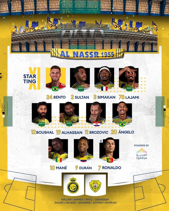 利雅得勝利首發(fā):24-本托、2-哈納姆、3-西馬坎、78-奧賈米、12-納瓦夫、19-哈桑、11-布羅佐維奇、20-安吉洛、10-馬內(nèi)、9-杜蘭、7-C羅