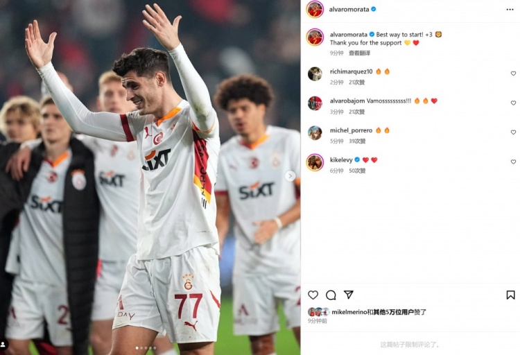賽后莫拉塔也曬出本場慶祝照片,配文寫道:“以最好的方式開局,拿下三分,感謝大家的支持!”