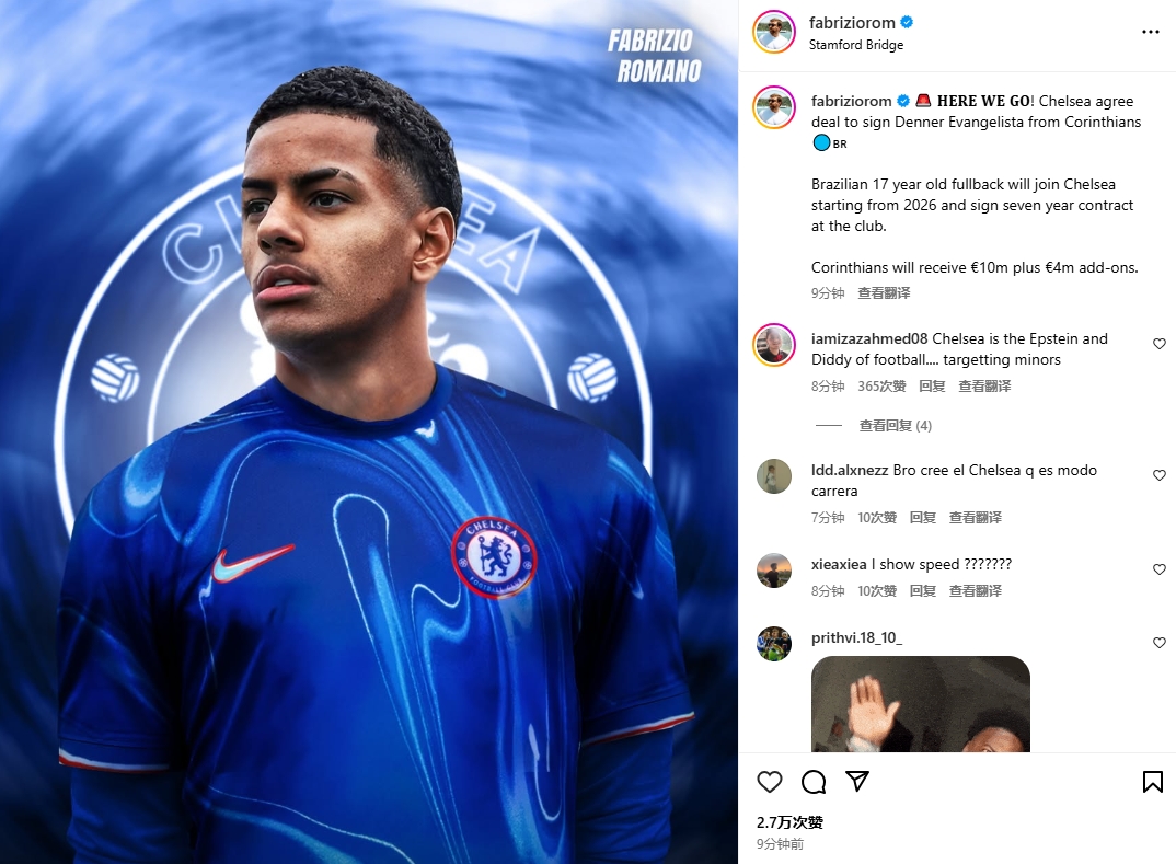 17歲的科林蒂安小將登納2008年2月25日出生,他還沒有為一線隊(duì)效力過。羅馬諾表示,登納將在年滿18歲后也即是2026年才加盟切爾西,簽約時(shí)長為7年??屏值侔卜矫鎸⑹盏娇們r(jià)1400萬歐的轉(zhuǎn)會(huì)費(fèi)(1000萬固定+400萬附加)。