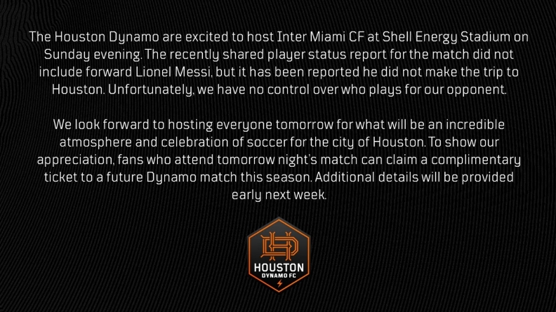 休斯頓迪納摩俱樂(lè)部很高興能在周日晚上在主場(chǎng)迎戰(zhàn)邁阿密國(guó)際俱樂(lè)部。最近的比賽球員狀態(tài)報(bào)告中沒(méi)有梅西,據(jù)報(bào)道稱他沒(méi)有前往休斯頓。