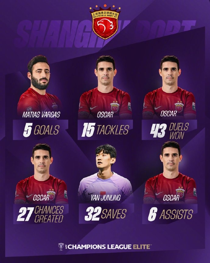 3月2日訊 今天亞冠聯(lián)賽官博曬出了海港球員在亞冠精英賽聯(lián)賽階段的數(shù)據(jù)海報(bào),其中前隊(duì)長奧斯卡多項(xiàng)數(shù)據(jù)居首。