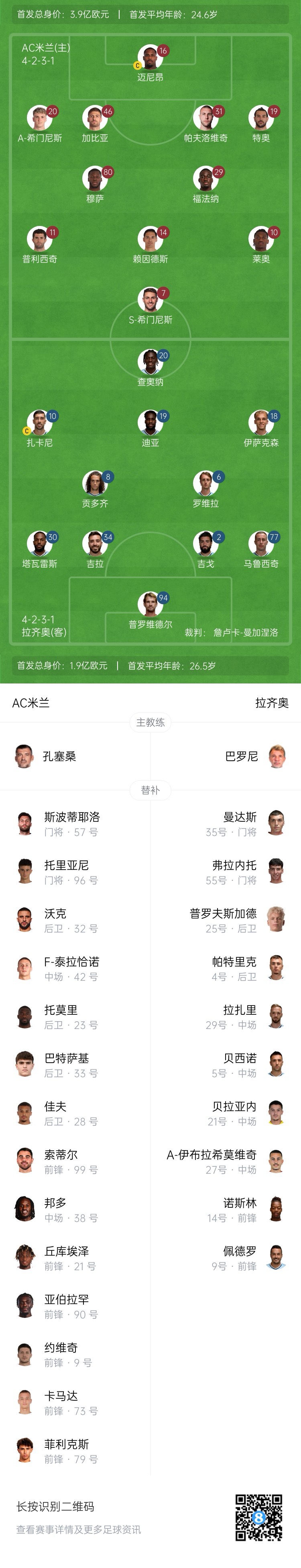 3月3日訊 意甲第27輪,AC米蘭主場迎戰(zhàn)拉齊奧比賽即將打響。賽前首發(fā)出爐。