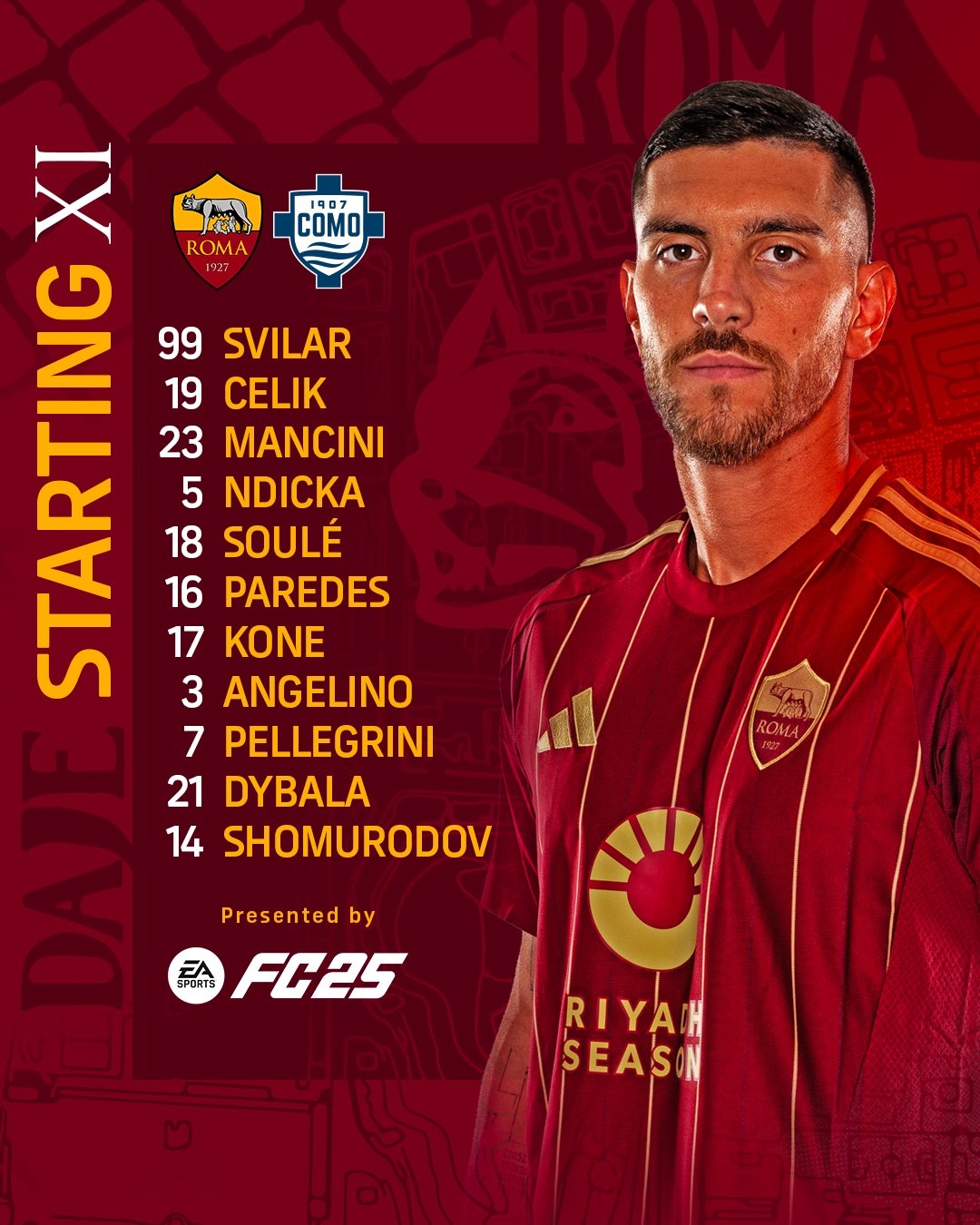 羅馬VS科莫首發(fā):迪巴拉領(lǐng)銜,帕雷德斯、佩萊格里尼、蘇萊出戰(zhàn)