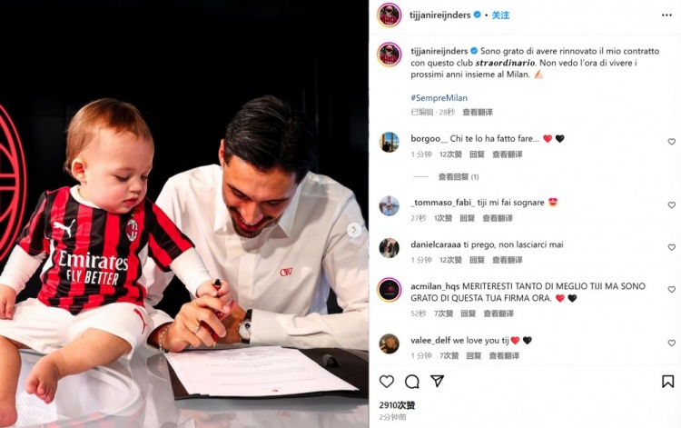賴因德斯通過(guò)社媒曬出自己帶著孩子在續(xù)約合同上簽字的照片,并配文:“很感激能夠和這家非凡的俱樂(lè)部完成續(xù)約,非常期待未來(lái)幾年繼續(xù)為米蘭效力?!?/p>