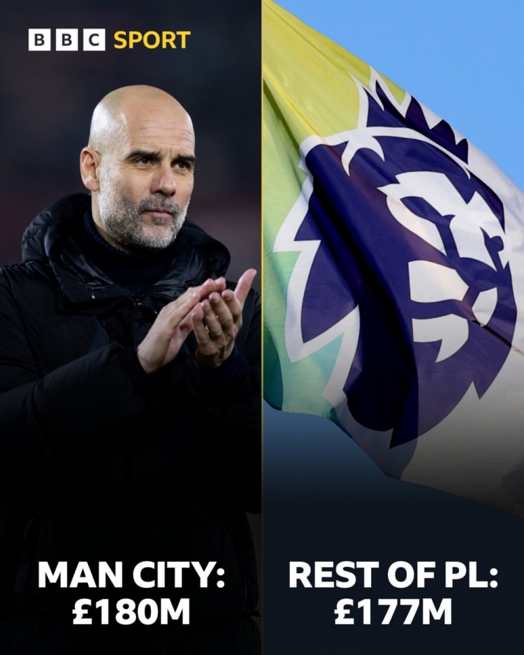 曼城冬窗簽下雷斯、尼科-岡薩雷斯、胡桑諾夫、馬爾穆什4位重要新援,BBC指出,曼城這個(gè)冬窗花費(fèi)1.8億英鎊引援,而英超其余19隊(duì)花費(fèi)1.77億英鎊。
