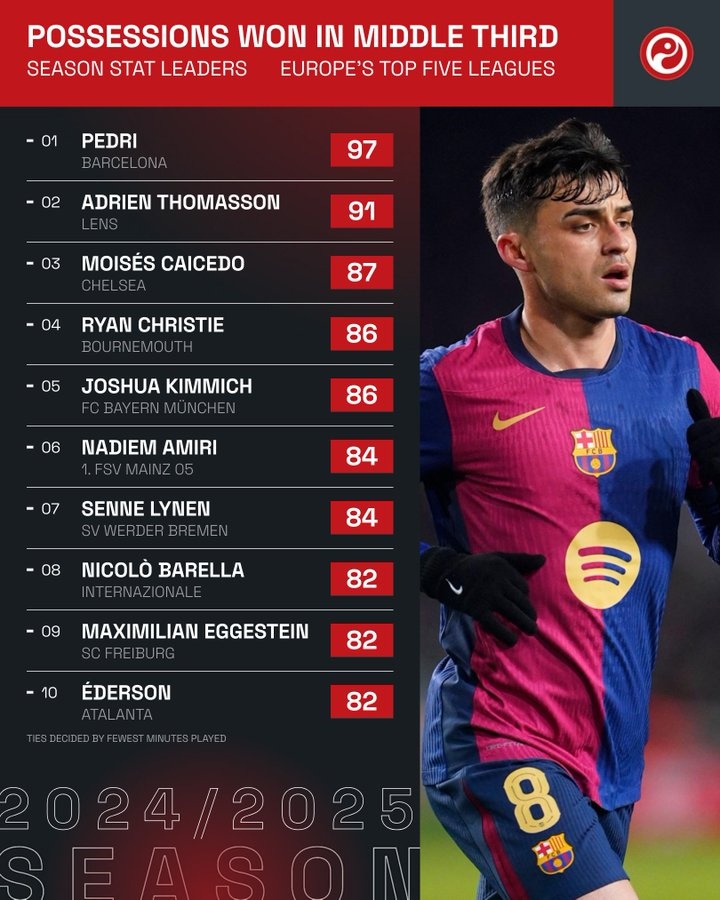 3月4日訊 Squawka統(tǒng)計(jì)表明,佩德里是本賽季五大聯(lián)賽在中場區(qū)域搶回球權(quán)次數(shù)最多的球員。