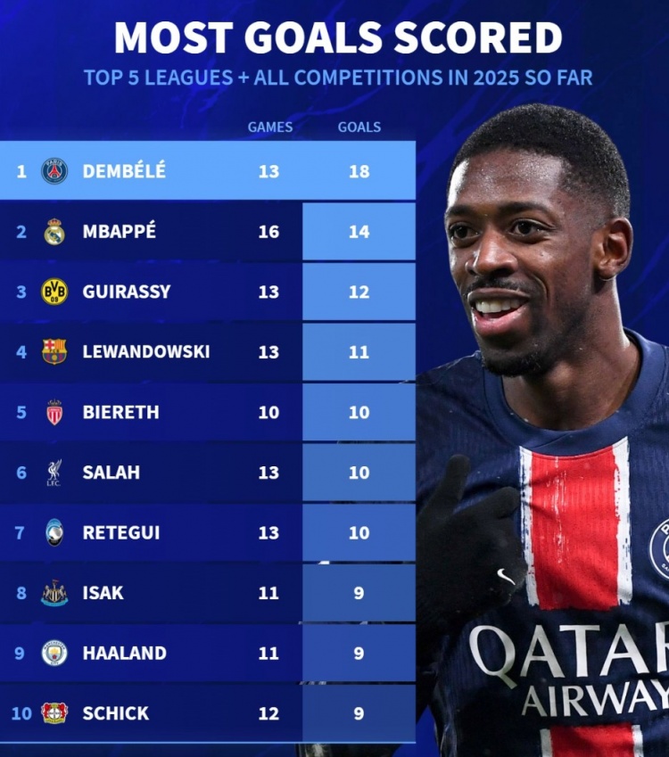 3月4日訊 《轉會市場》統(tǒng)計了2025年五大聯賽球員各項賽事進球情況,登貝萊居首。