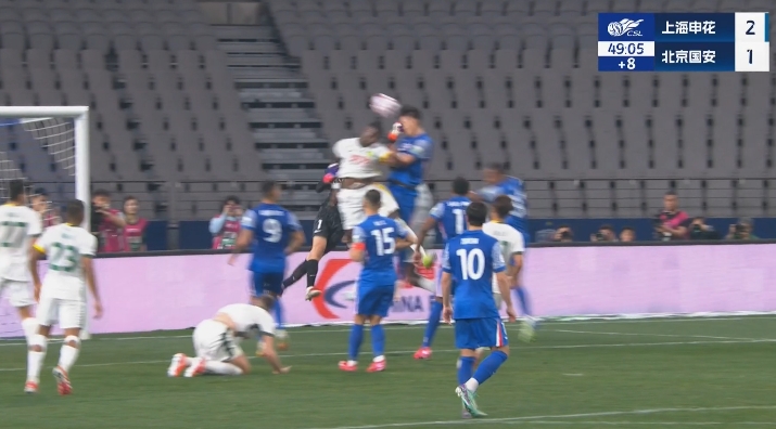 上一輪申花vs國安上半場補(bǔ)時階段,申花前場任意球,韓佳奇出擊稍慢一步,拳擊蔣圣龍面部。
