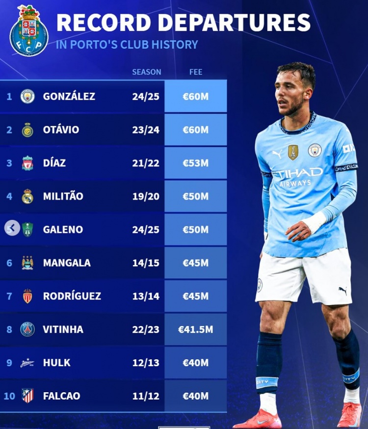2月4日訊 曼城已經(jīng)官宣簽下波爾圖中場尼科-岡薩雷斯,《轉(zhuǎn)會市場》也統(tǒng)計(jì)了波爾圖隊(duì)史賣人最貴榜。