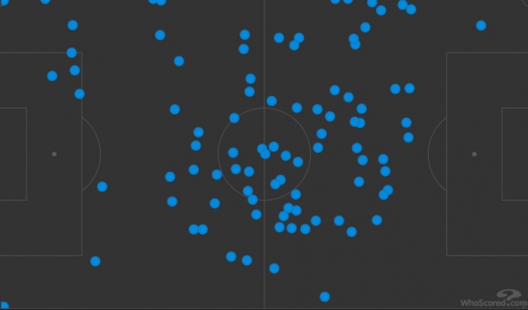 中場的傳球散點圖:幾乎沒有幾次好的向前機會