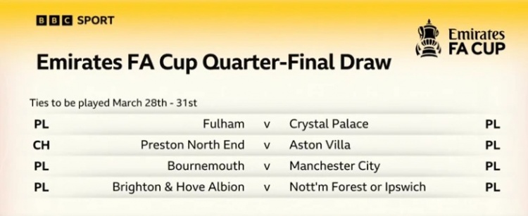 3月4日訊 在諾丁漢森林總比分6-5淘汰伊鎮(zhèn)后,本賽季足總杯8強球隊出爐。