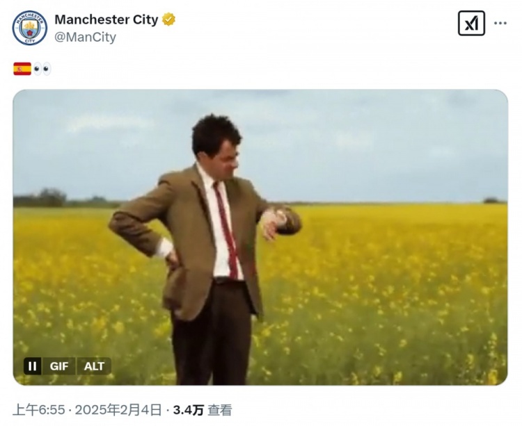 曼城官方社媒曬出憨豆先生焦急等待并看表的動圖,配上了西班牙國旗,以及眼睛的表情符號,預熱尼科-岡薩雷斯加盟,隨后曼城官宣了這筆交易。