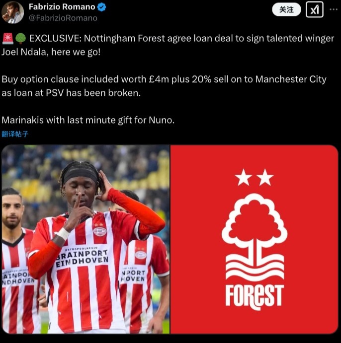 羅馬諾在社媒寫道:“獨家消息:諾丁漢森林同意以租借方式簽下天才邊路球員喬爾-恩達拉,HWG!由于曼城和埃因霍溫就球員租借的相關事項已經破裂,諾丁漢森林從中介入,據悉租借合同中將附帶400萬鎊+20%未來轉會分成的買斷條款?!?/p>