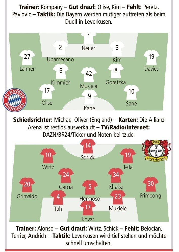 諾伊爾/萊默爾、于帕梅卡諾、金玟哉、戴維斯/基米希、格雷茨卡/奧利塞、穆西亞拉、薩內/凱恩