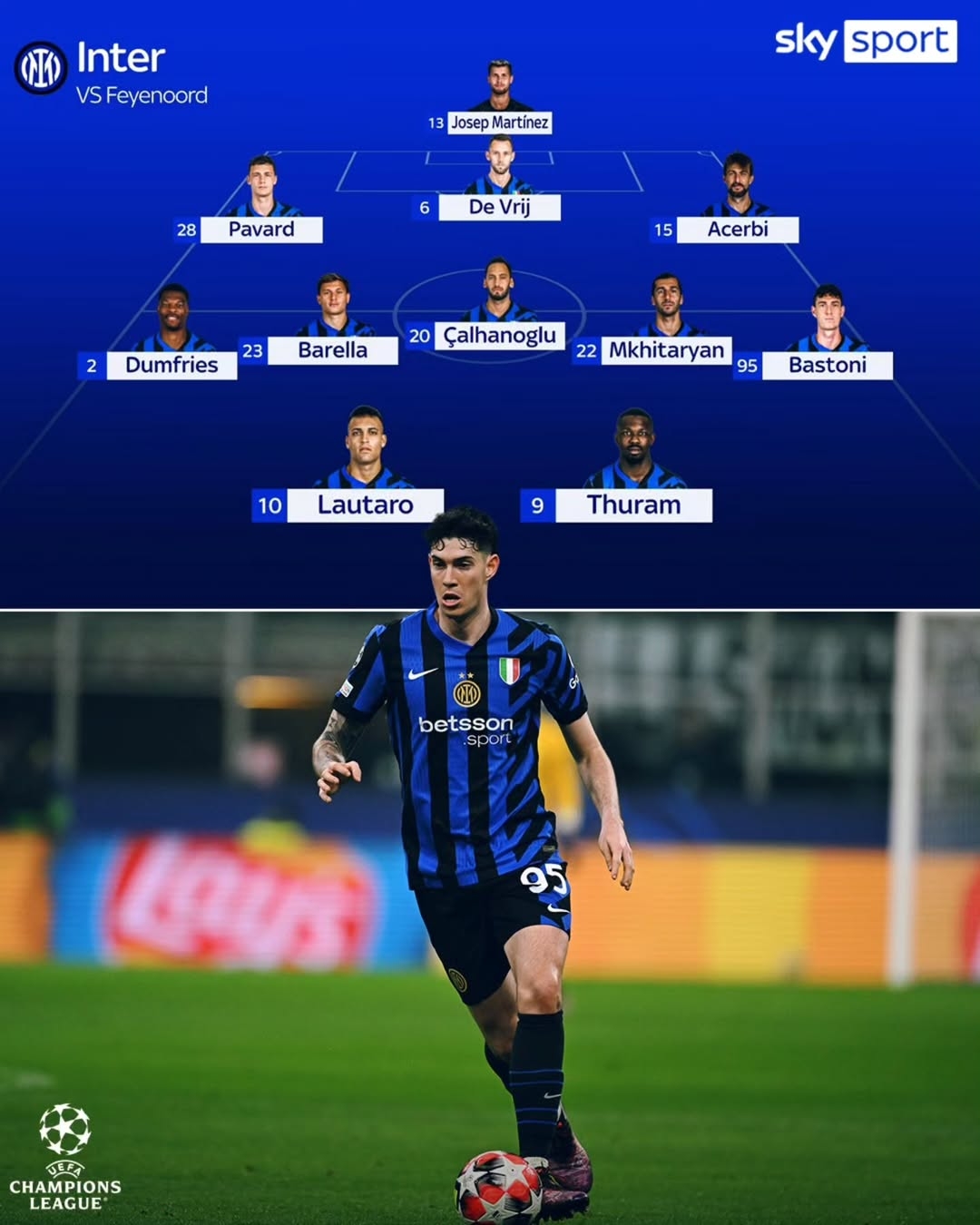3月5日訊 本周四凌晨1:45,歐冠1/8決賽首回合,國(guó)米將在客場(chǎng)對(duì)陣費(fèi)耶諾德。賽前,意大利天空體育預(yù)測(cè)了國(guó)米的首發(fā)陣容。