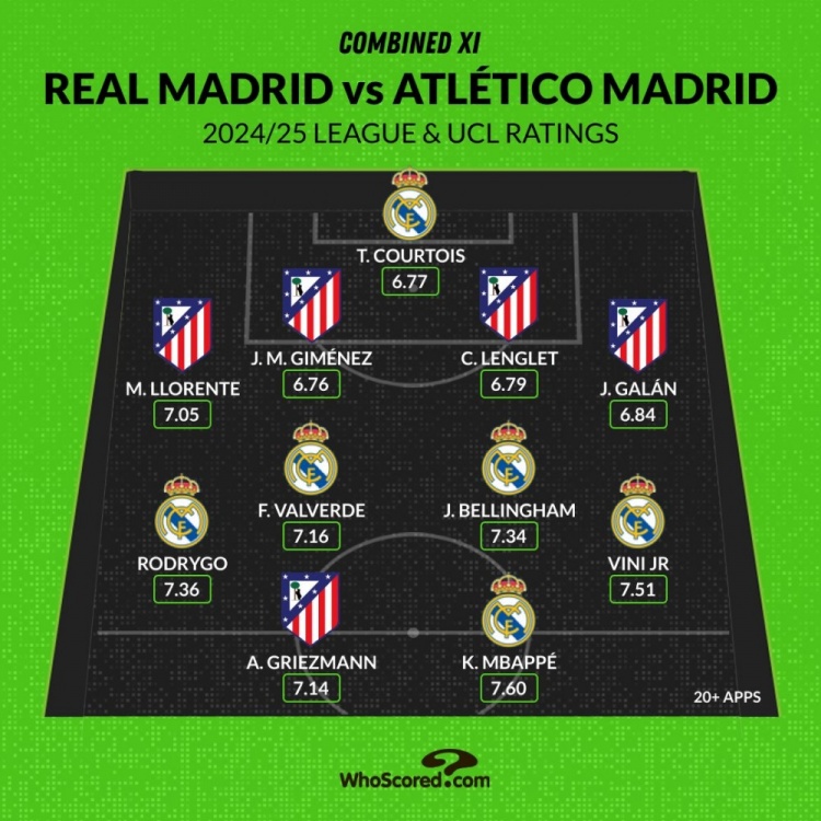 whoscored列馬德里德比本賽季聯(lián)賽+歐冠評(píng)分最佳陣:至少出戰(zhàn)20場(chǎng)比賽