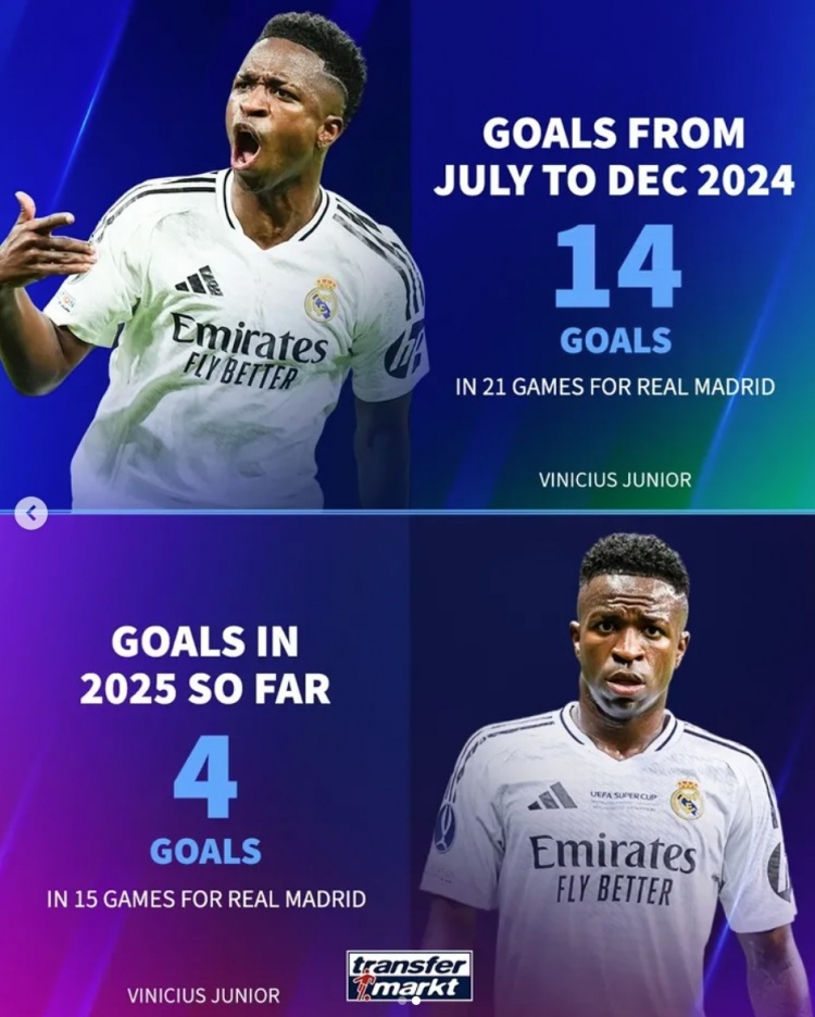數(shù)據(jù)統(tǒng)計(jì)顯示,維尼修斯在本賽季上半程(7月至12月)21場(chǎng)打進(jìn)14球,而進(jìn)入2025年后15場(chǎng)僅4球入賬。