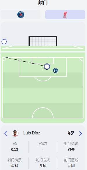 歐冠1/8決賽首回合利物浦1-0巴黎,全場(chǎng)紅軍只有兩次射門(mén),一次形成進(jìn)球,另一次則是迪亞斯的頭球偏出。