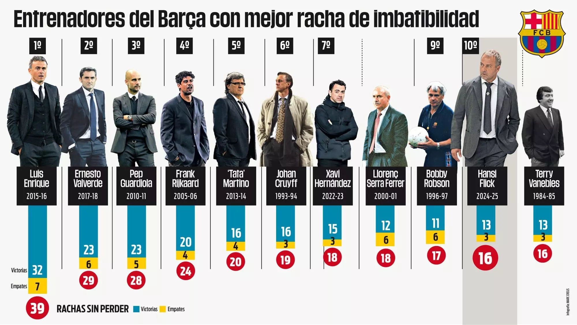 弗里克目前率巴薩連續(xù)16場(chǎng)不敗排隊(duì)史第10,第1是恩里克的39場(chǎng)