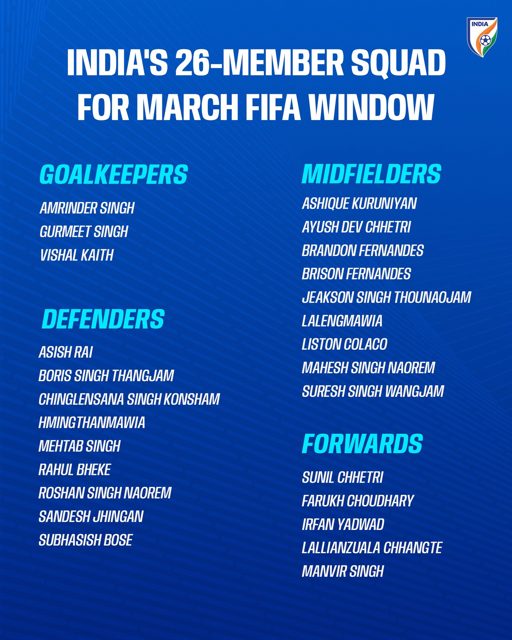 印度將在3月19日友誼賽對(duì)陣馬爾代夫,3月25日亞足聯(lián)亞洲杯預(yù)選賽對(duì)陣孟加拉國(guó)。