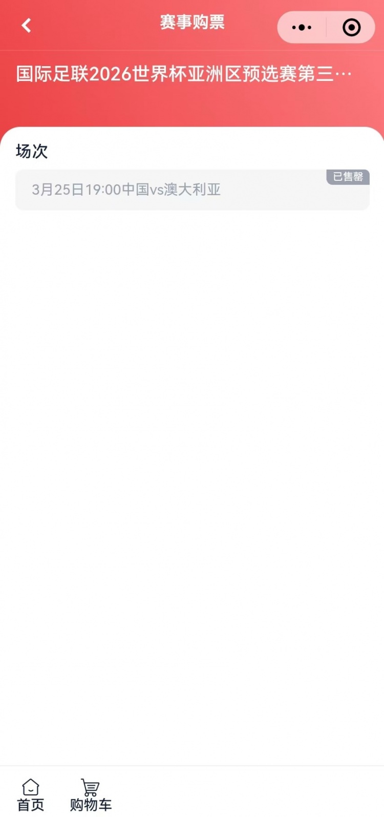 3月7日訊 國(guó)足將于3月25日于世預(yù)賽18強(qiáng)戰(zhàn)主場(chǎng)迎戰(zhàn)澳大利亞,本場(chǎng)球票在今日17點(diǎn)開(kāi)售,多個(gè)平臺(tái)迅速售罄。
