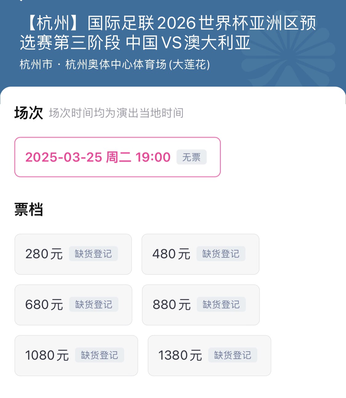 3月25日18強(qiáng)賽國(guó)足vs澳大利亞門(mén)票早已售罄,官方票務(wù)信息顯示,3月11日0:00起停止退票。這個(gè)時(shí)間點(diǎn)將成為最后的“撿漏”(回流票)的機(jī)會(huì)。