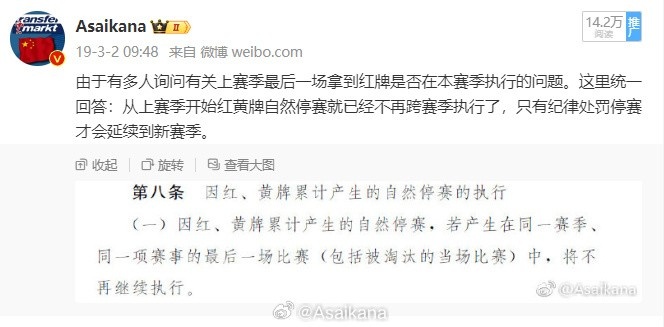 從2018賽季起,中國(guó)足協(xié)賽事的自然停賽隨賽季結(jié)束自動(dòng)消除(此前是紅牌自然停賽或紀(jì)律處罰需要跨賽季)