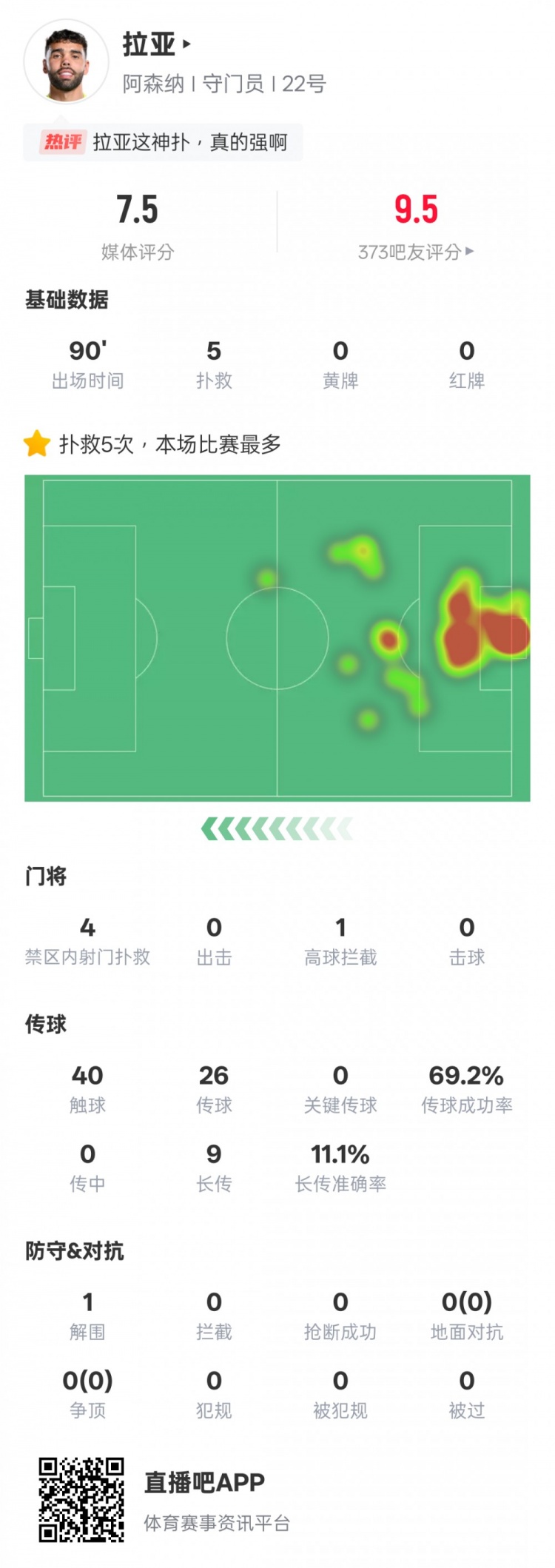 3月10日訊 英超第28輪,阿森納1-1曼聯(lián),拉亞首發(fā)出戰(zhàn),貢獻(xiàn)全場(chǎng)最多的5次撲救,其中有4次是撲救對(duì)手禁區(qū)內(nèi)的射門(mén),他還有1次高球攔截,評(píng)分7.5。