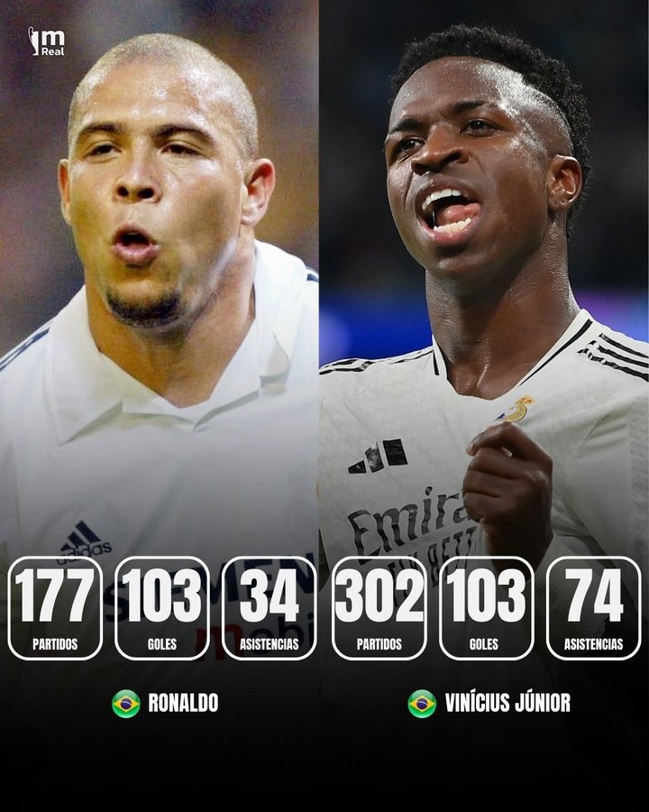 統(tǒng)計(jì)表明,維尼修斯現(xiàn)在已經(jīng)為皇馬打進(jìn)103球,追平同胞羅納爾多,成為皇馬隊(duì)史進(jìn)球并列最多的巴西球員。